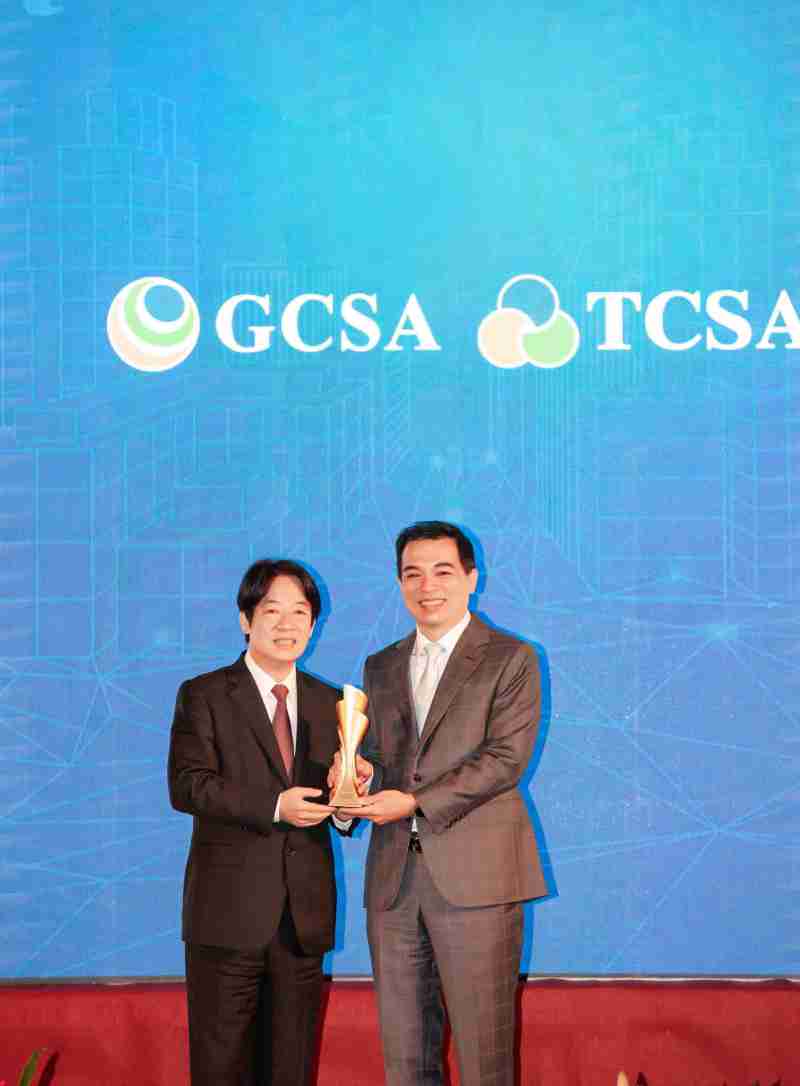 达全方位永续表现获全球永续奖及台湾永续奖肯定,,由副总统赖清德颁奖 (左),,,EBpay总经理柯富仁 (右) 代表领奖