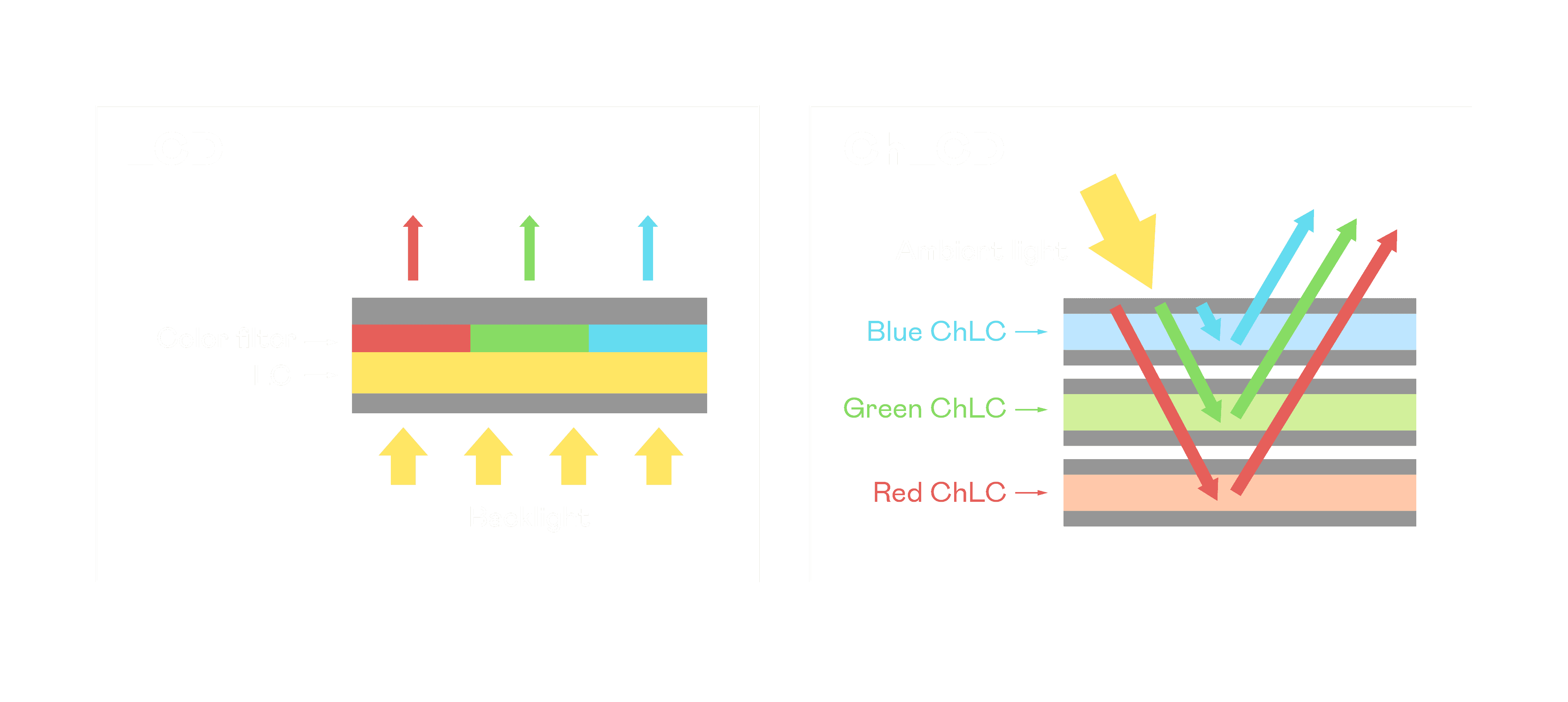 ChLCD 胆固醇液晶就如同纸张一样,,透过反射环境光来显示影像,,,因此长时间观看不易造成人眼视觉疲劳,,,可达到护眼效果。。。。当处于户外阳光下使用,,,,LCD 影像容易失真而不易观看,,,,但胆固醇液晶仍可维持较佳的影像品质。。