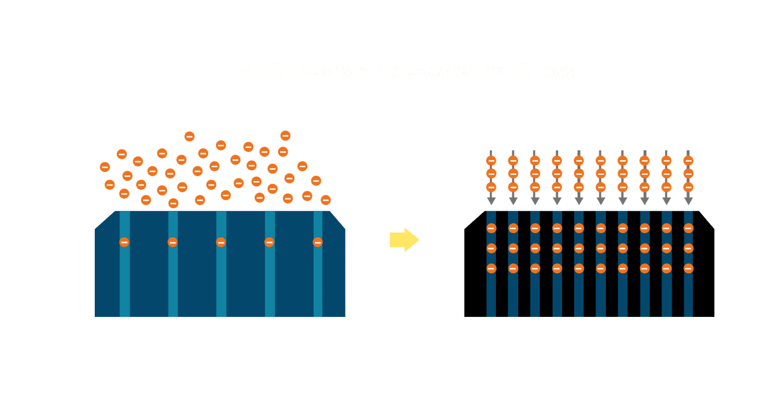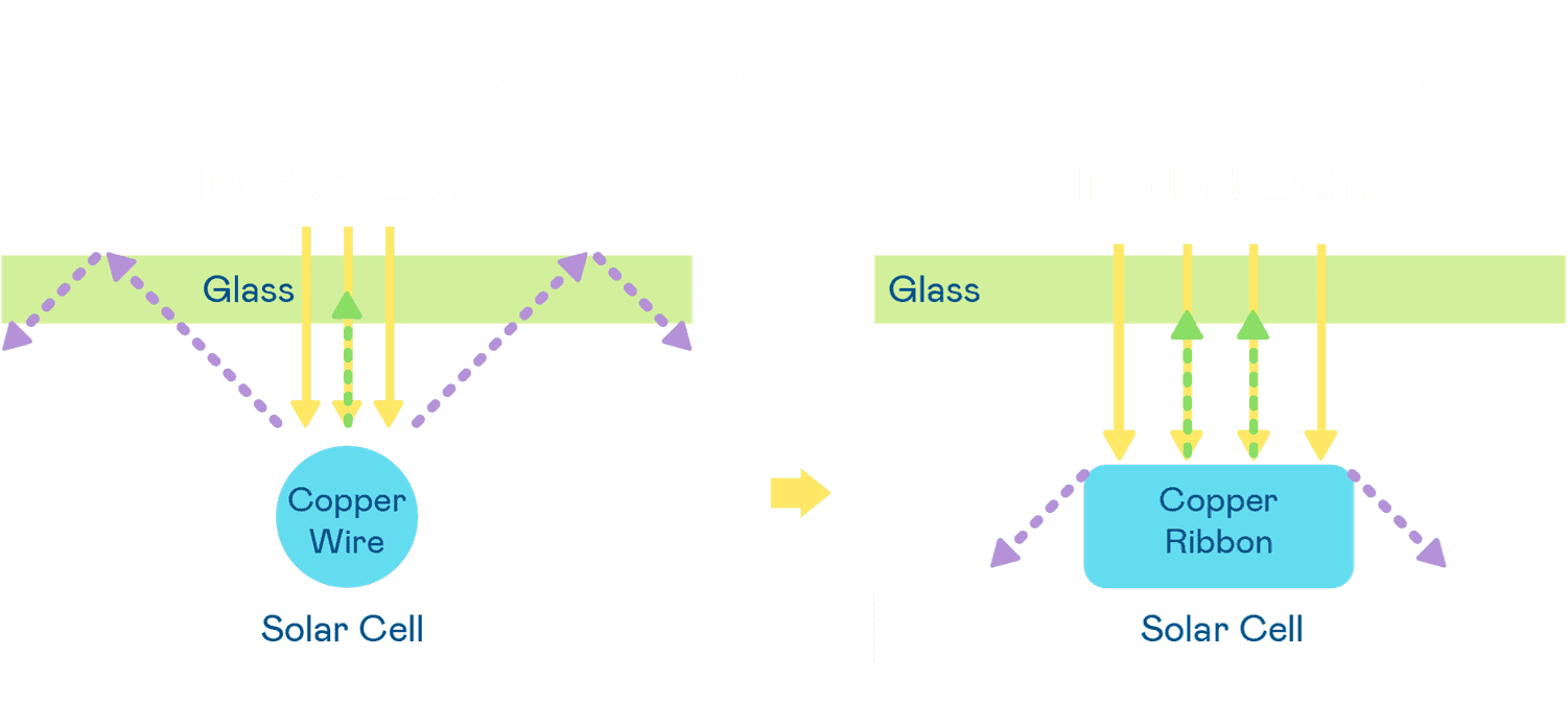 - 电池使用多条铜导线 (Copper wire) 于电池片上形成较短的电流路径,,,,提高电流收集效率,,,采用圆形设计的铜导线较传统扁平式的铜焊带 (Ribbon),,可增加入射至电池的光线量。。。。