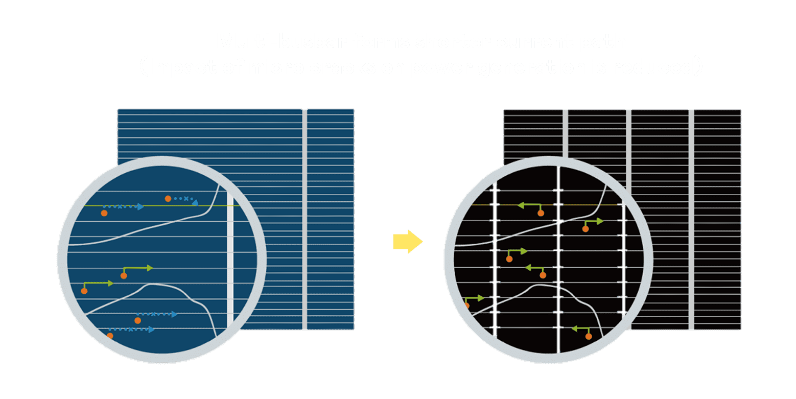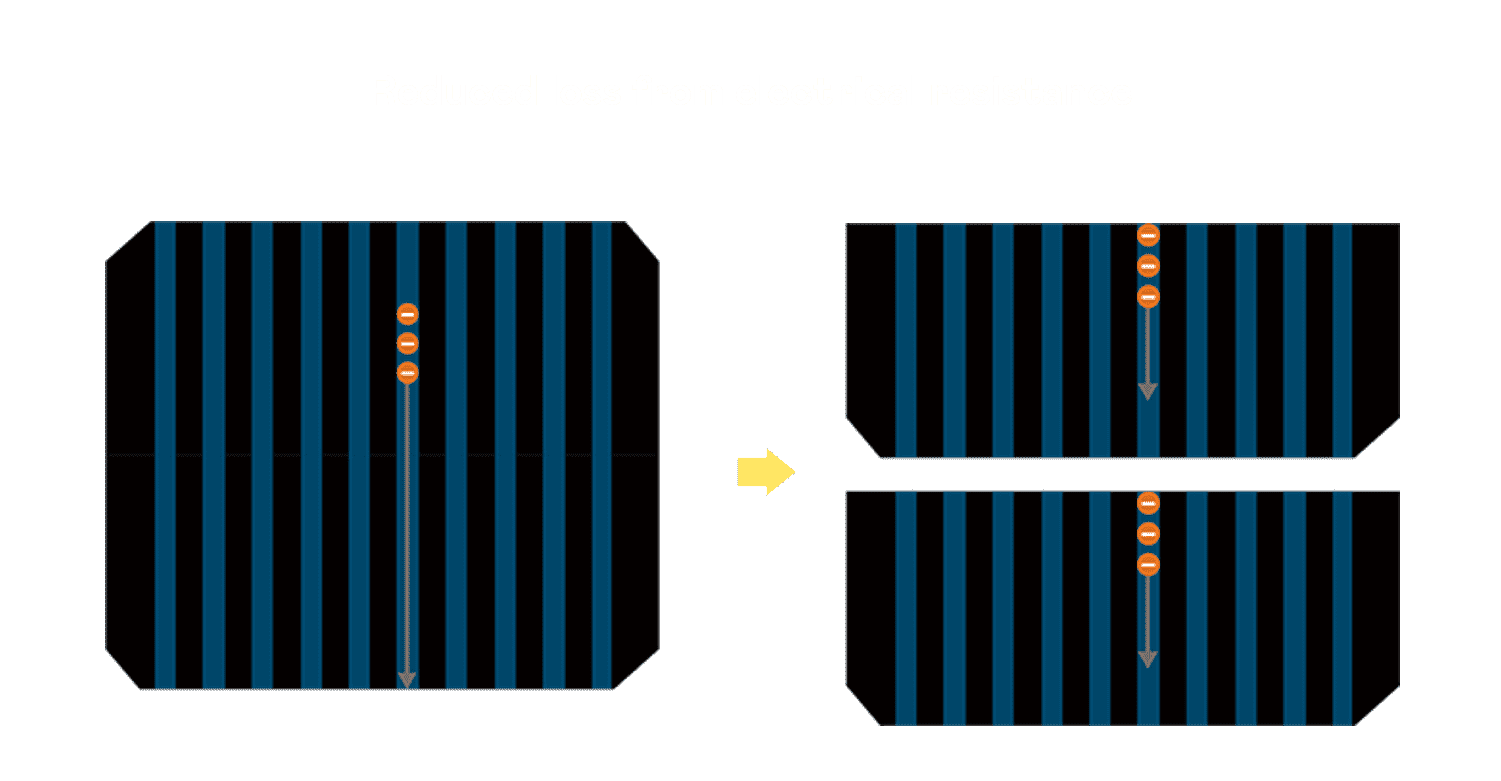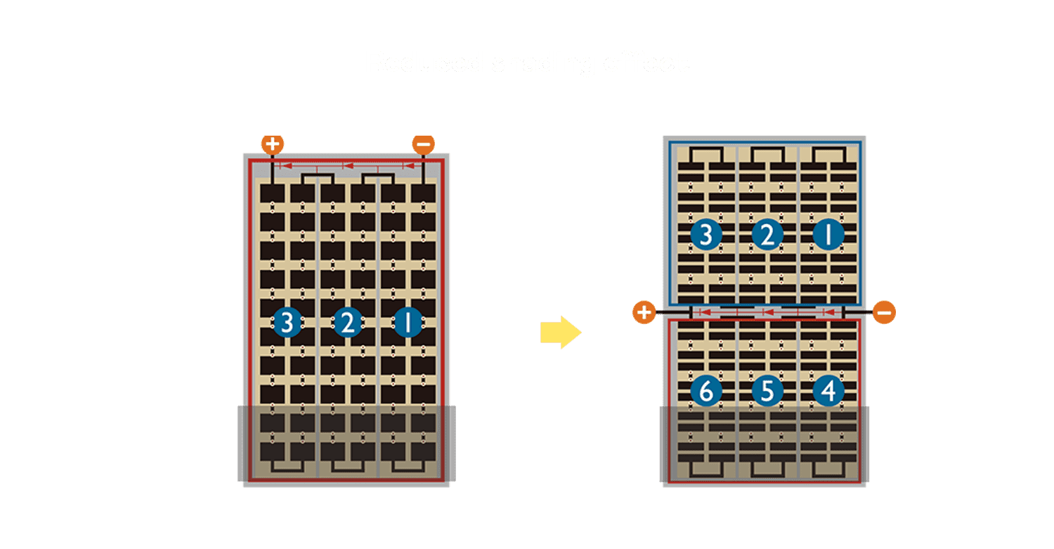- 结合半切电池,,,降低遮阴影响、、、、提升模组抗隐裂能力、、并减少电阻损耗,,进一步提升模组发电效能。。。